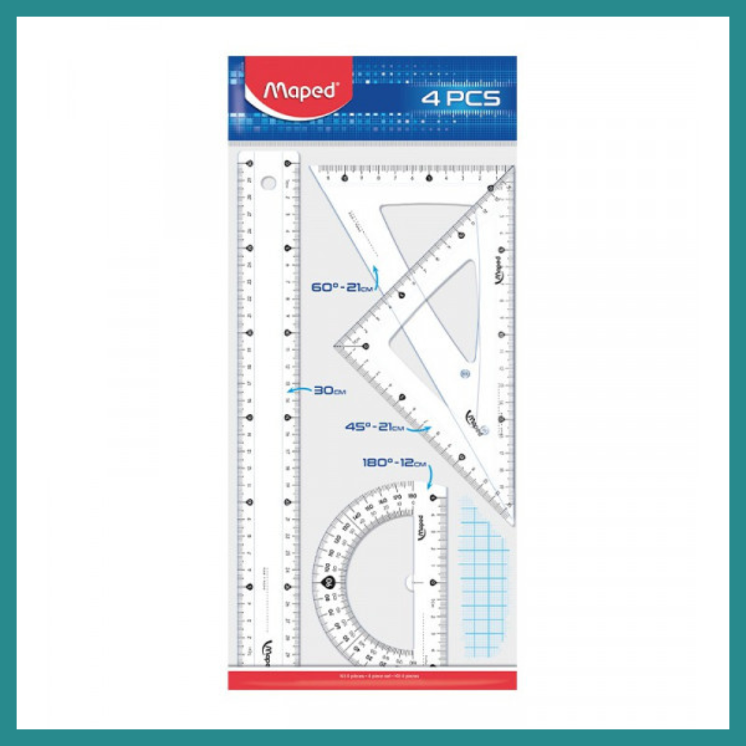 ✅ Contient 1 règle, 2 équerres et 1 rapporteur